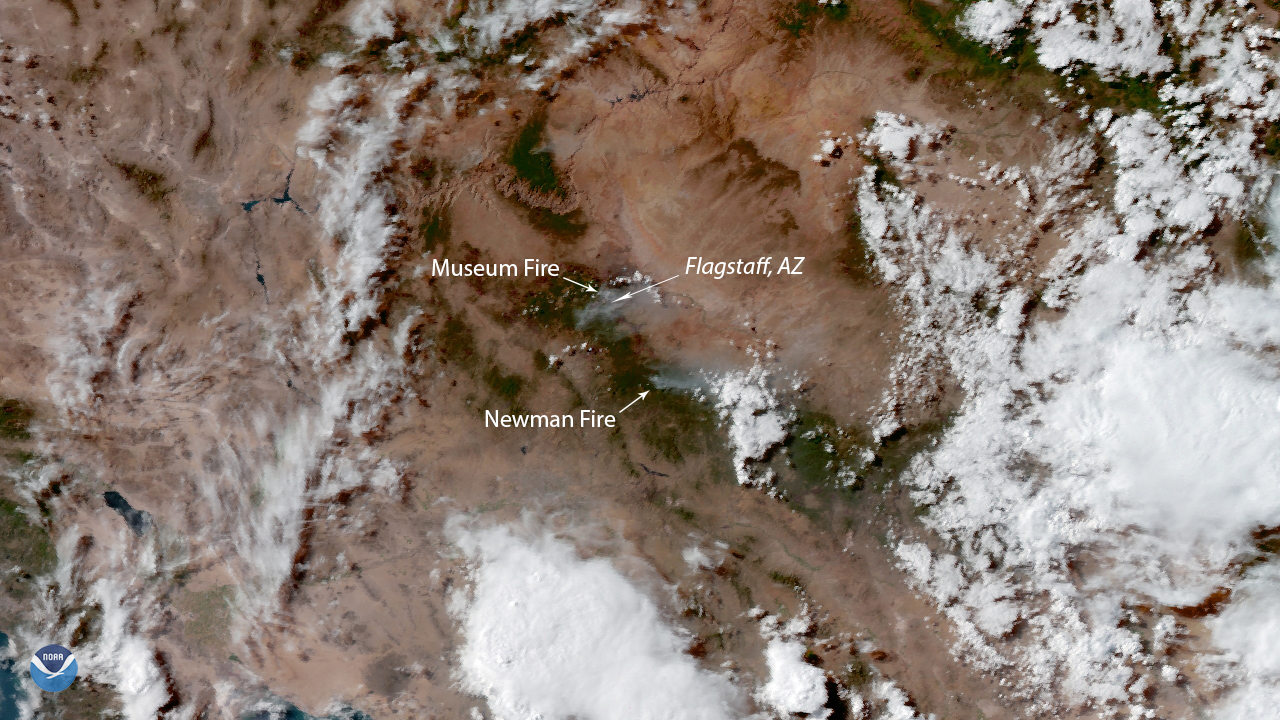 NOAA’s GOES West satellite zoomed in on two wildfires near Flagstaff, Ariz. on July 23, 2019. The Museum Fire , currently searing…