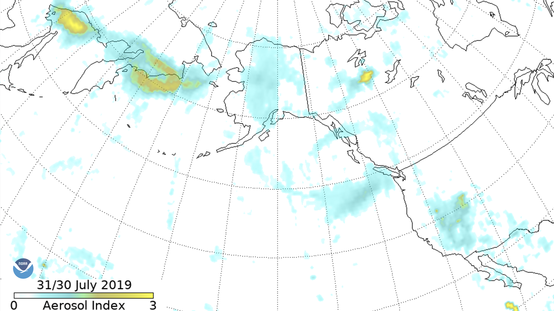 The Suomi-NPP Ozone Mapping and Profiler Suite (OMPS) aerosol index shows smoke moving across eastern Russia into Alaska, down the west…