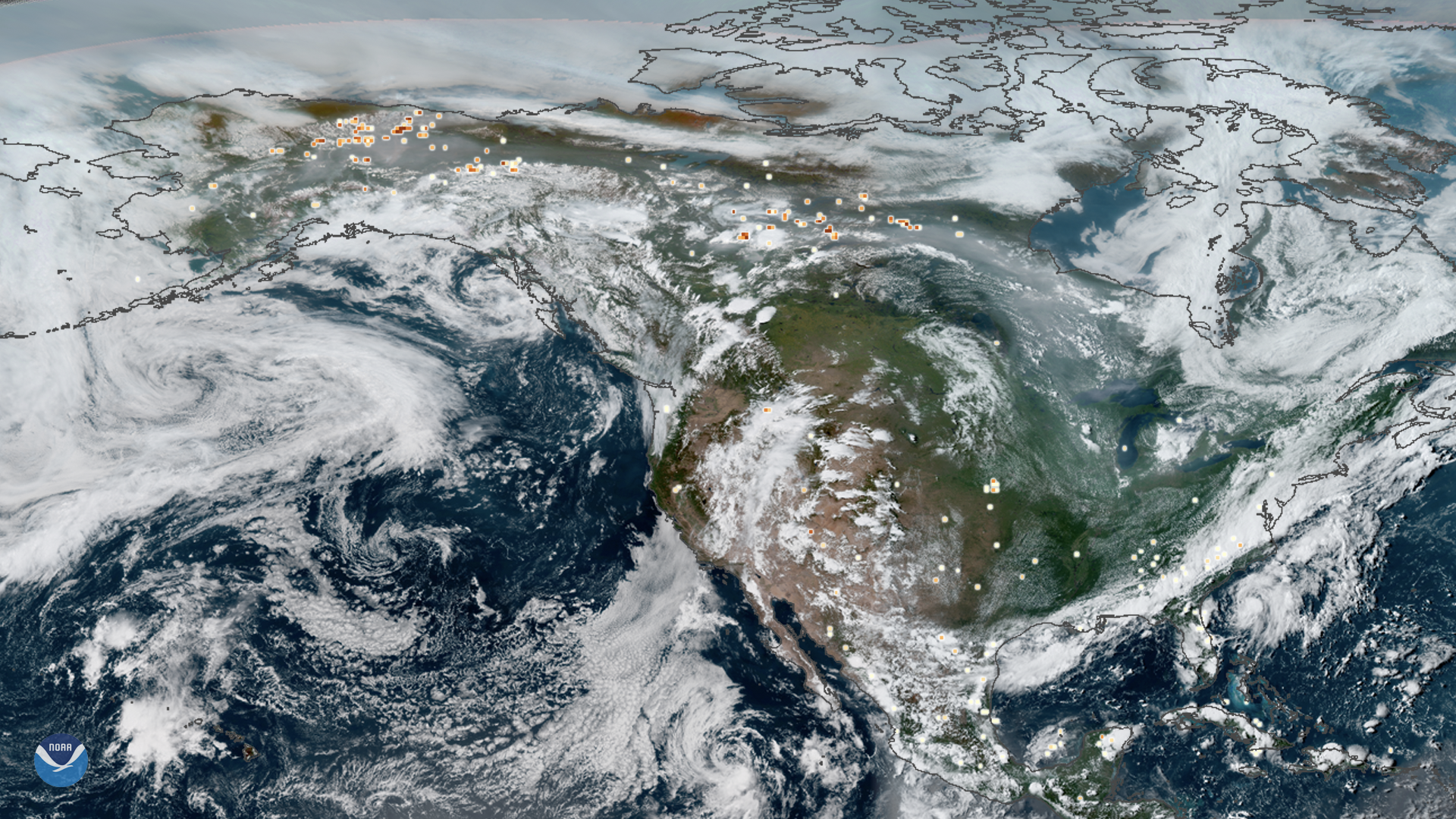 This true-color composite image of smoke from Arctic wildfires spreading across Alaska and Canada was captured by both GOES East and…
