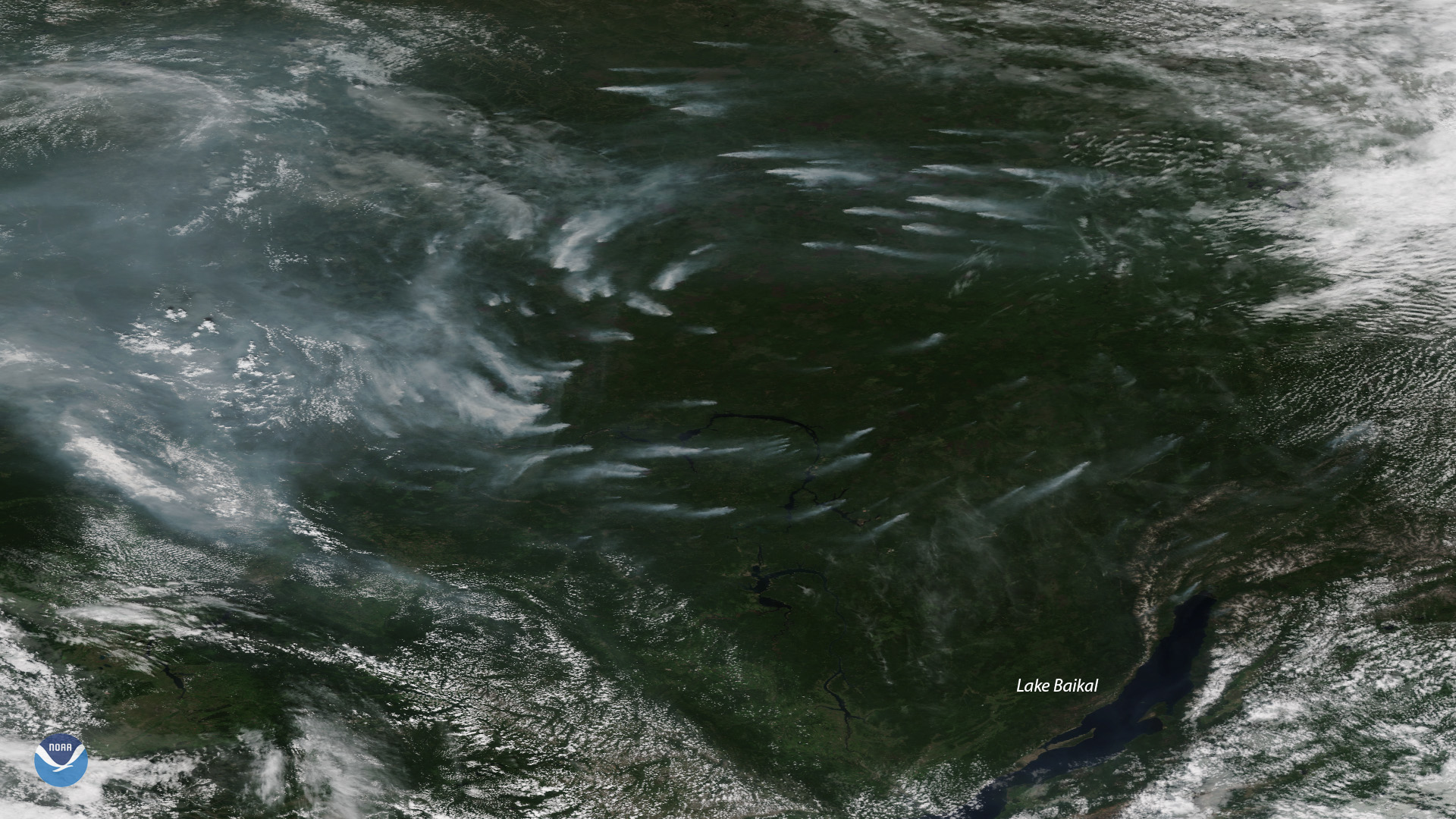 Plumes of smoke from more than a dozen large, active wildfires burning northwest of Russia’s Lake Baikal are seen in this NOAA-20…