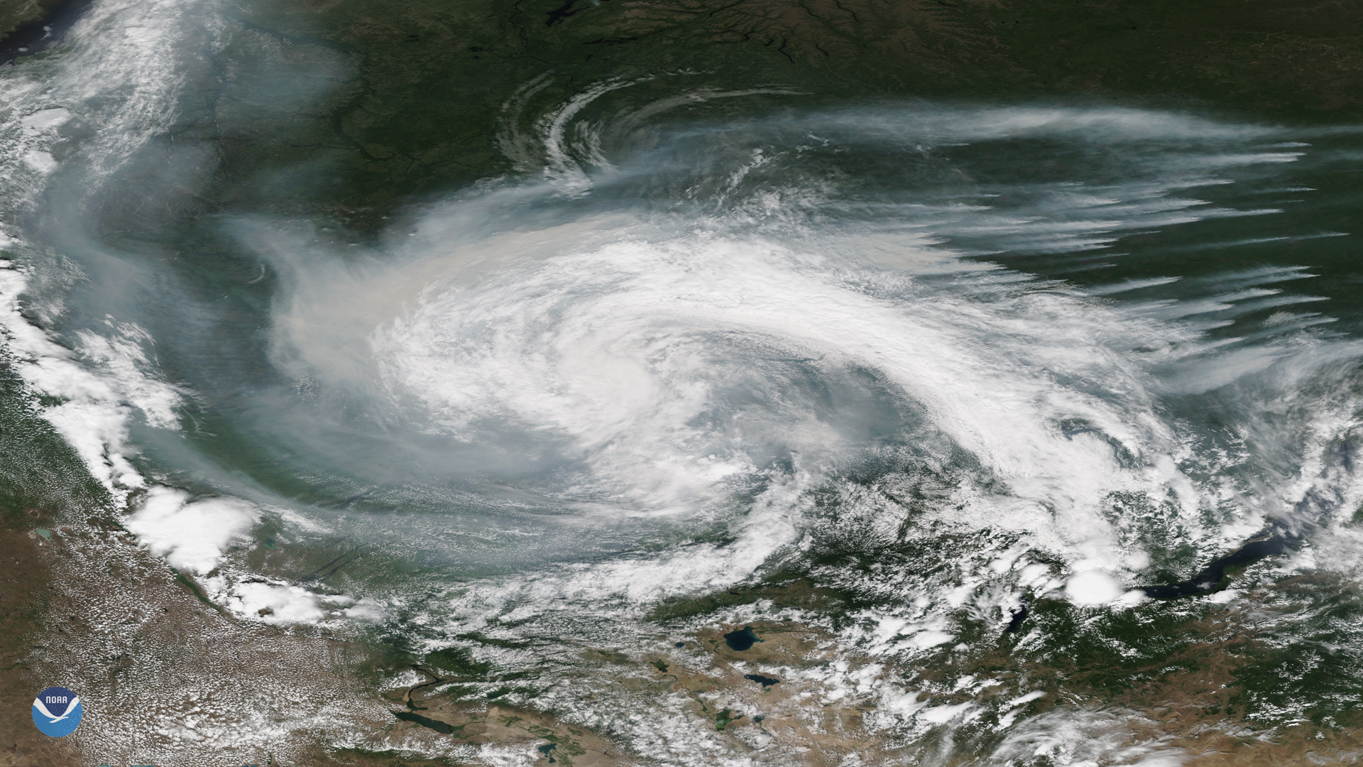 Smoke from active wildfires burning across northern Russia got caught in a low pressure system near the Verkhne-Tazovsky State Natural…