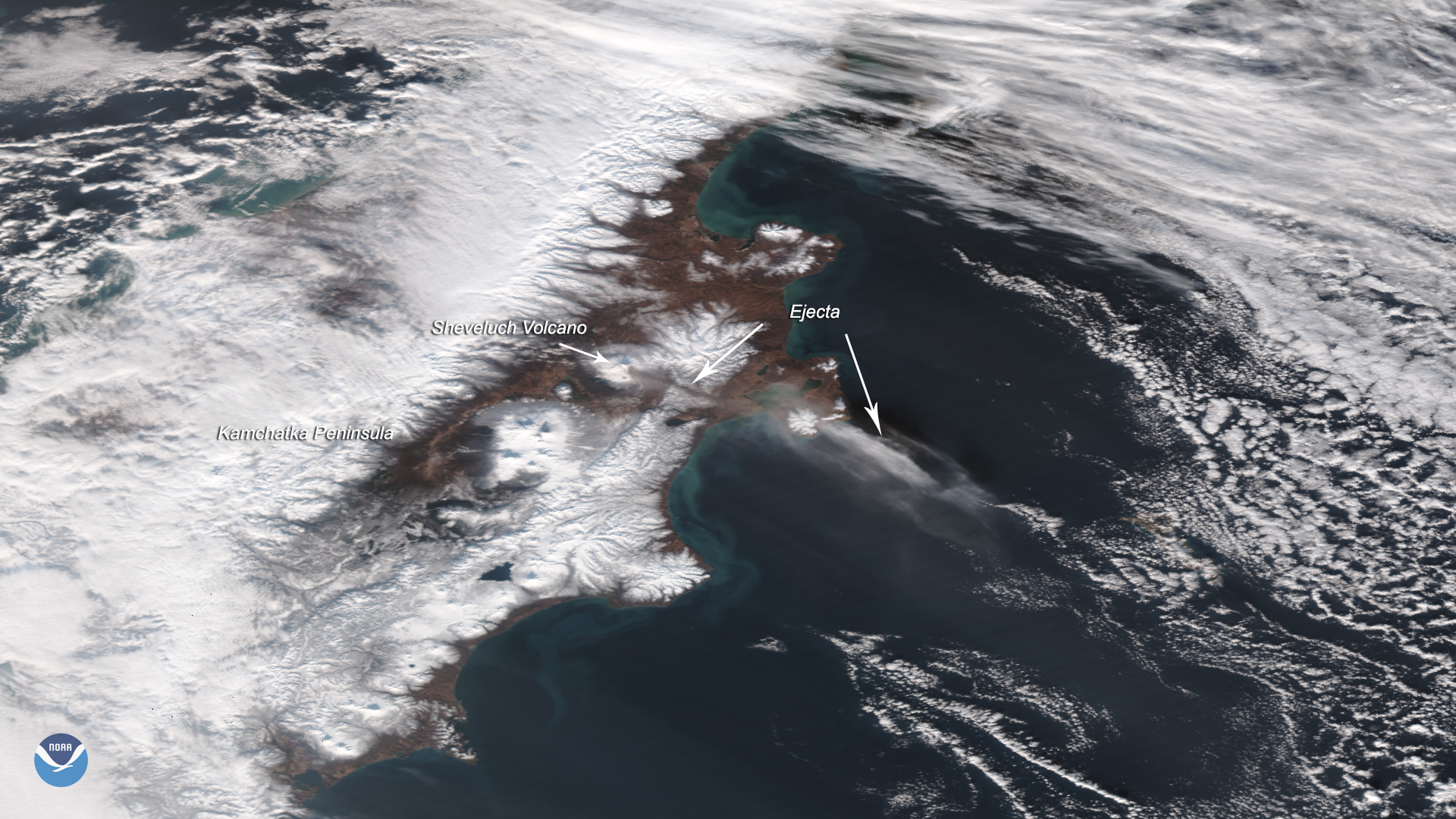 The Suomi-NPP satellite captured this image of the Sheveluch volcano erupting on Nov. 12, 2019, which affected flights over an area…
