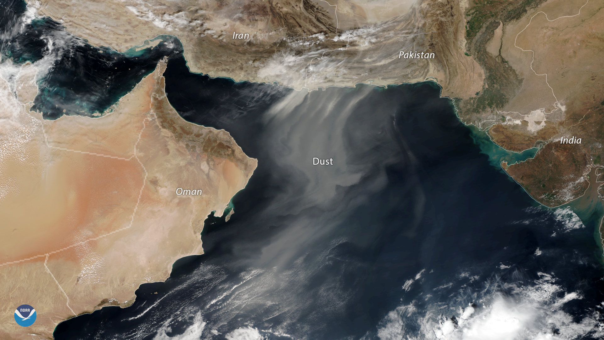 NOAA-20 imagery shows dust blowing from Pakistan and Iran over the Gulf of Oman and the Arabian Sea.