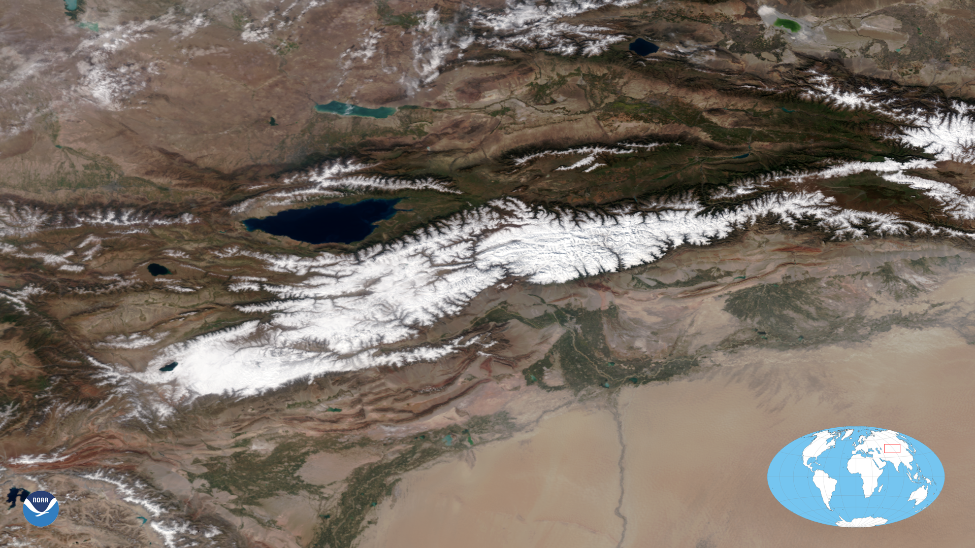 On Sept. 21, 2020, the NOAA-20 satellite was able to snap this cloudless True Color image of the snow-covered Tian Shan mountain…