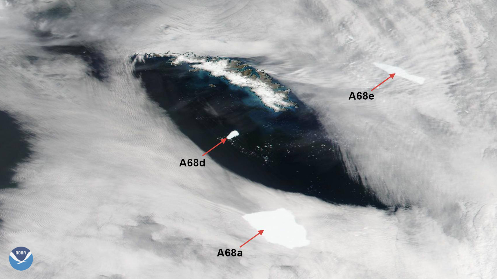 On Jan. 11, 2021, the NOAA-20 satellite viewed icebergs A-68A, A-68D, and A-68E move around South Georgia Island.