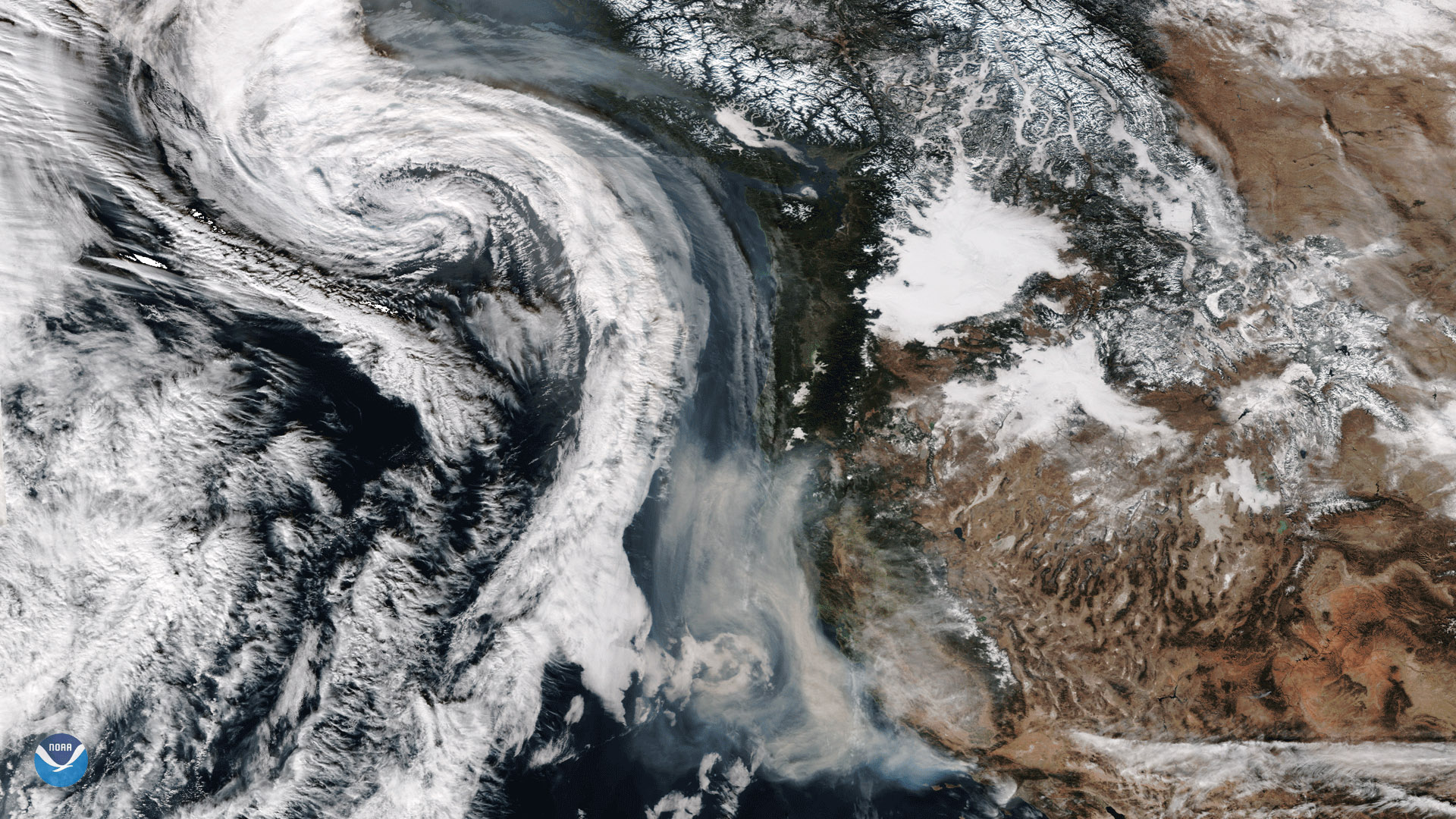 The Suomi-NPP satellite captured this image of smoke from California's wildfires being drawn northward into an approaching storm system.