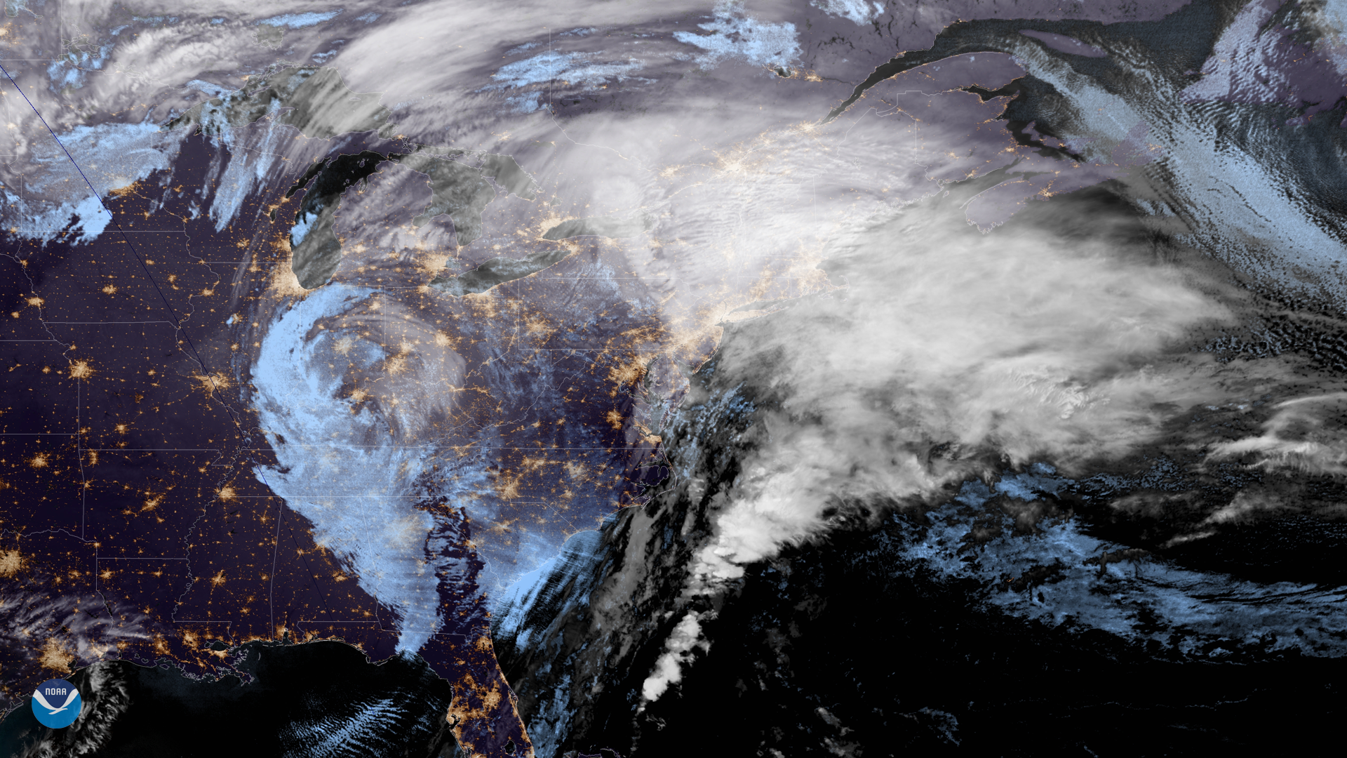 The GOES East satellite is watching a developing storm system bringing wintry weather to many states east of the Rockies.